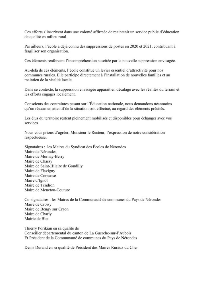 Vous trouverez ci-jointe la lettre ouverte signée par les élus du territoire rattaché à l’école publique de Nérondes, relative au projet de suppression d’un poste d’enseignant à la rentrée prochaine.